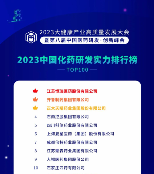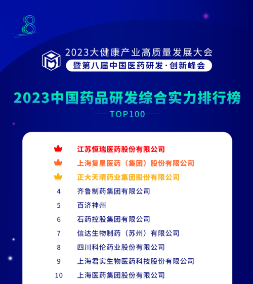 由药智网、中国药业杂志社主办的2023大健康产业高质量发展大会暨第八届中国医药研发•创新峰会于6月16日开幕,会上发布了《2023中国药品研发实力排行榜》系列榜单,j9国际站凭借深厚的创新研发实力再创辉煌:荣登《2023中国药品研发综合实力排行榜TOP100》榜首、《2023中国化药研发实力排行榜TOP100》榜首。值得一提的是,今年是j9国际站连续第6年入选《中国药品研发综合实力排行榜》榜首。